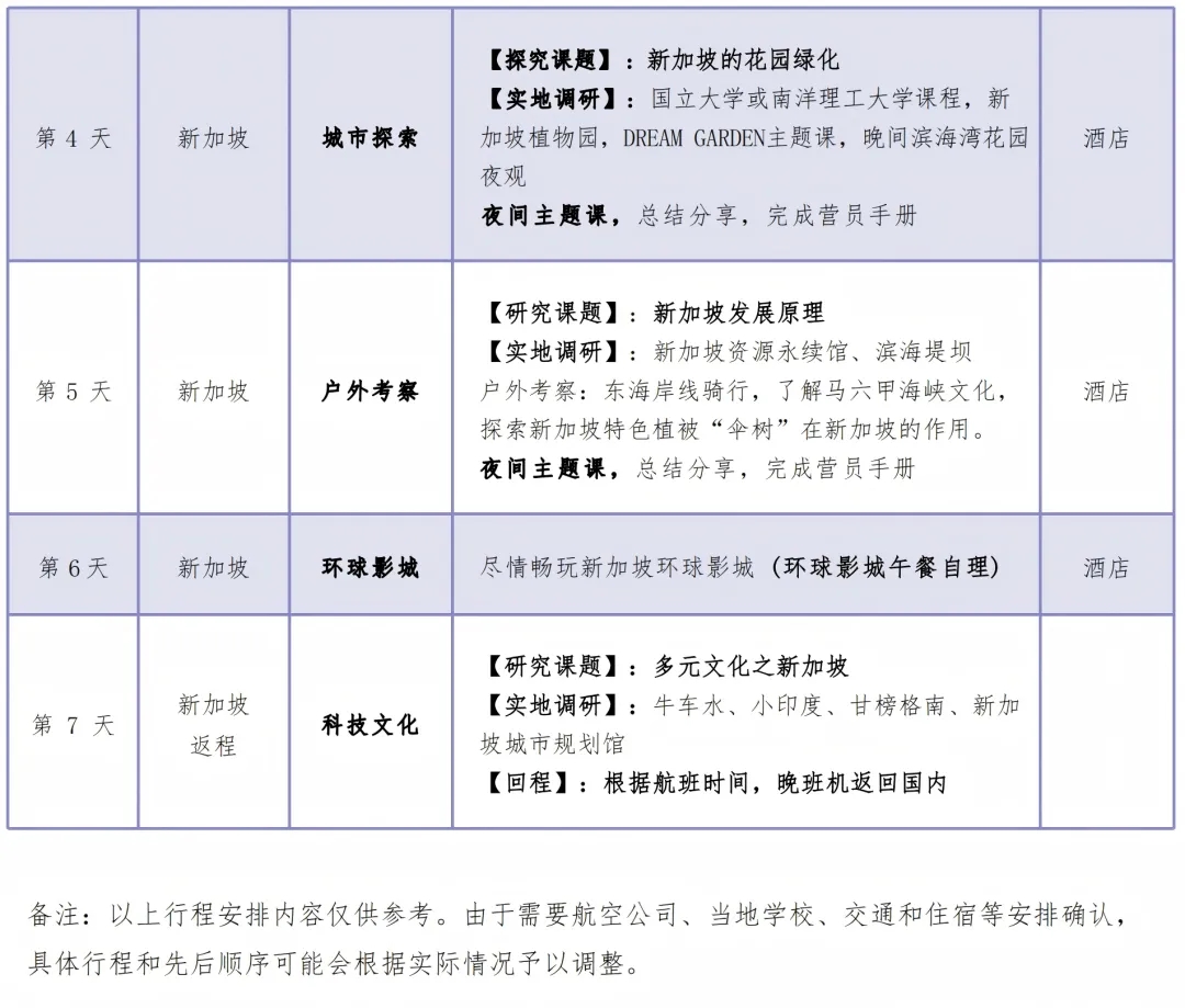 在“户外考察日”,同学们将来到新加坡的东海岸公园,在生态环境绝佳的公园里骑行,了解当地的生物多样性;也将去到孩子们最爱的“环球影城”、“乐高乐园”,相信双乐园的极致体验会让孩子们度过一段无比快乐的时光。