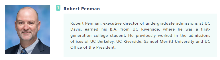 罗伯特-彭曼(Robert Penman)是加州大学戴维斯分校本科招生执行主任,他在加州大学河滨分校获得学士学位,是该校的第一代大学生。他曾在加州大学伯克利分校等招生办公室工作。