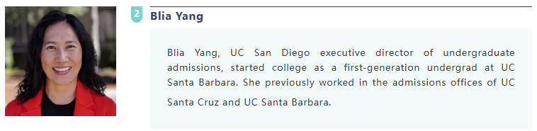 Blia Yang 是加州大学圣地亚哥分校本科招生执行主任,她是加州大学圣塔芭芭拉分校的第一代本科生,她曾在加州大学圣克鲁兹分校和加州大学圣塔芭芭拉分校招生办公室工作。