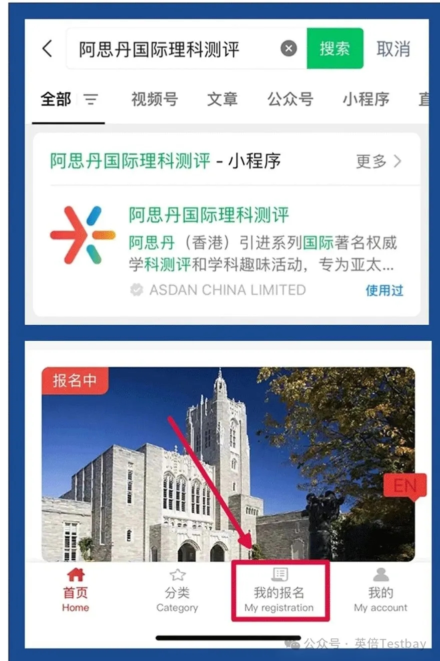 在“阿思丹国际理科测评”小程序上点击“我的报名”,进入“物理杯”美国高中物理测评项目,查询成绩!