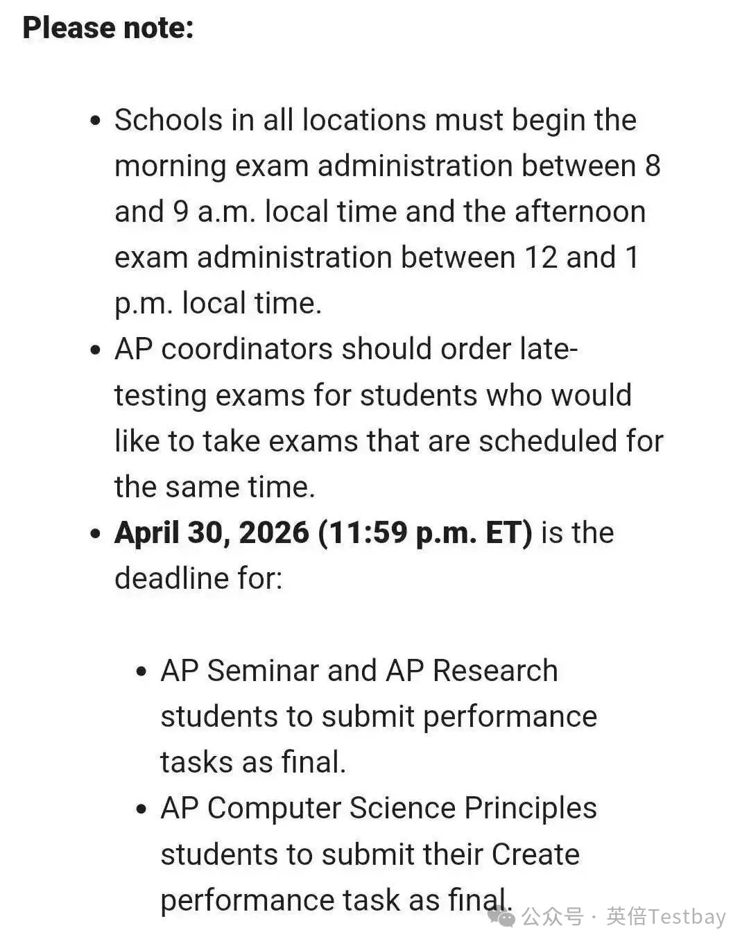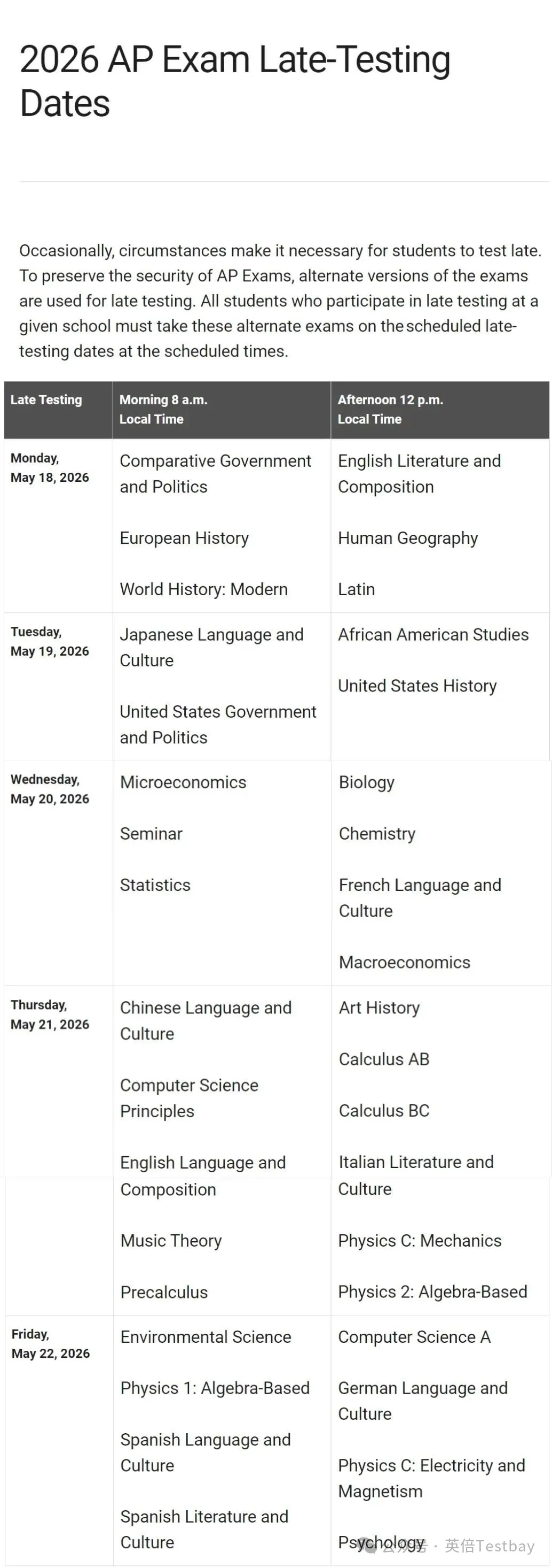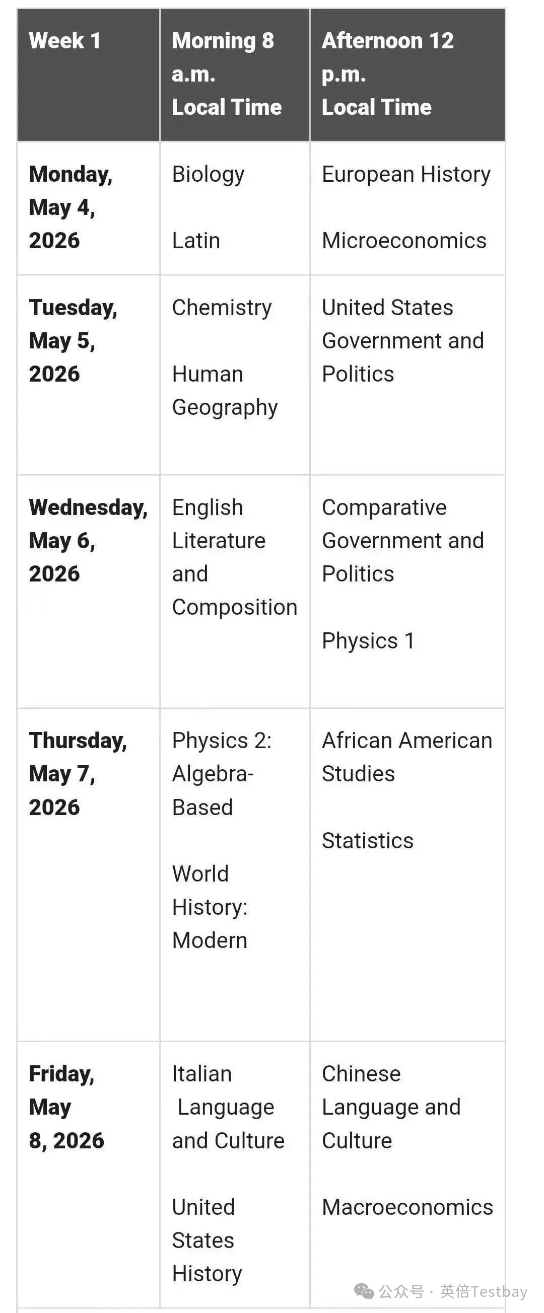 就在刚刚!CB官网公布了2026年AP考试日期。考试依旧将在5月的2个星期内进行,具体为5月4日到5月8日,以及5月11日到15日。