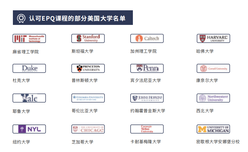 英国和美国名校官方明确表示欢迎有EPQ项目经历的学生,包括G5在内的世界顶级院校,均在官网对EPQ进行了官宣并推荐。能够出色完成EPQ项目的学生被证明具备高等教育强调的研究规划、独立学习和批判性思维能力,在同等课程和标化考试成绩的情况下,有EPQ认证的学生将拥有巨大的差异化竞争优势。在美国最普遍的申请系统(CA、CAAS、UC Application等)中,EPQ 均可作为学术经历和额外成绩的显著优势进行添加。