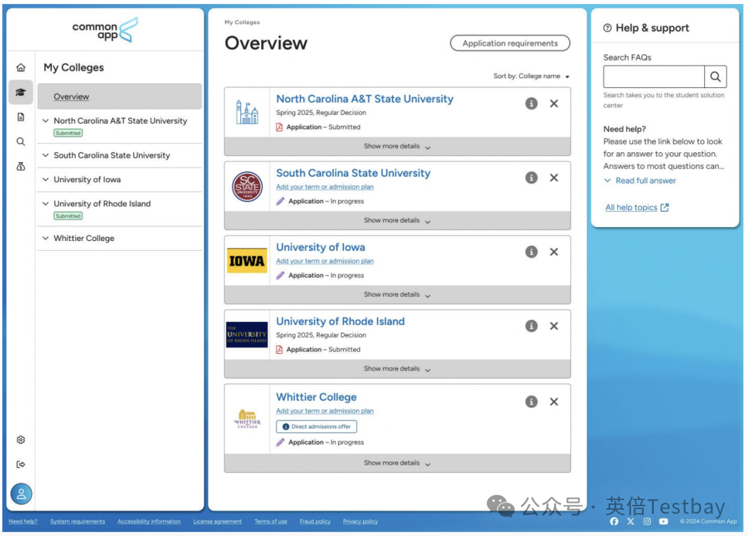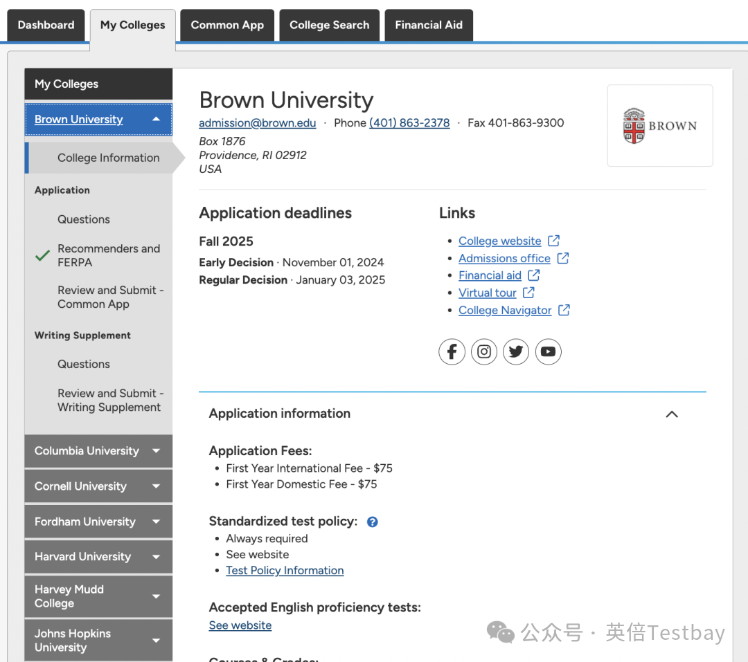 全新升级的"My Colleges"(我的大学)板块采用分区式布局,左侧清晰展示所有已添加和意向院校列表,并实时更新每所学校的申请状态。