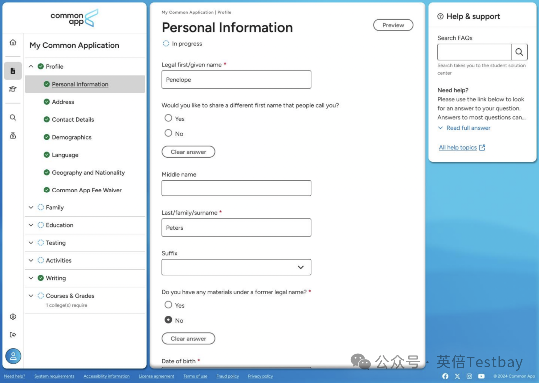 值得注意的是,"Common App"选项将更名为"My Common Application",并在导航栏中优先于"My Colleges"显示。系统还新增了进度指示功能,已完成的部分会显示绿色对勾标记,让申请者随时掌握完成情况。