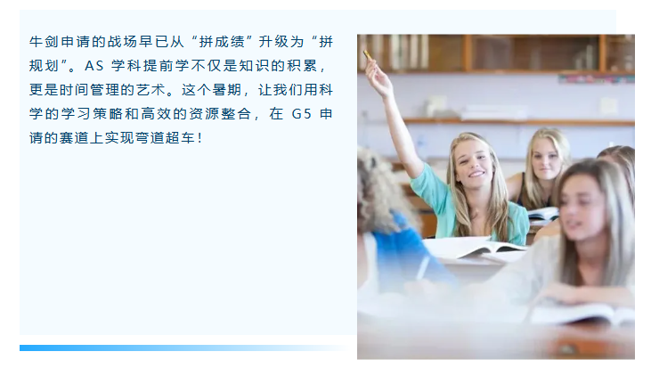 问题关键:如果 AS 学科学习拖延到秋季,你将同时面临学科学习、入学考试、文书写作、面试准备四重压力,极可能顾此失彼。