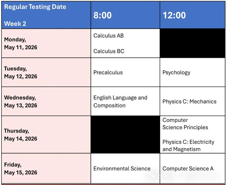 根据显示的考试周(Week 1, Week 2, Last-Testing, Art and Design)勾选(✅) 你需要报考的AP科目。仔细核对科目名称和考试时间(常规/延迟)。