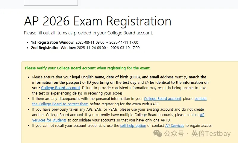 韩国Fulbright考评局正式开启了2026年AP考试第一轮报名。打算赴韩考试的学员们抓紧时间报名,在亚太地区,AP考试的考位竞争一向激烈——热门考点常常在报名开启后不久就被抢得所剩无几。每年下半年,不同国家和地区会陆续开放次年5月的AP考试报名,接下来一起看看韩国AP报名时间点。