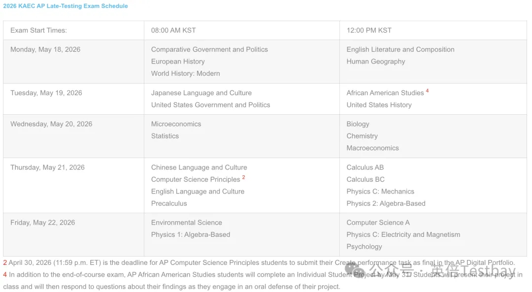 Fulbright Commission (South Korea)要求只有 2015年6月1日或之前出生的人才能参加 2026年 AP 考试。学生必须注册或隶属于中学(高中)才能参加 AP 考试。以下任何类别的学生都有资格参加考试: