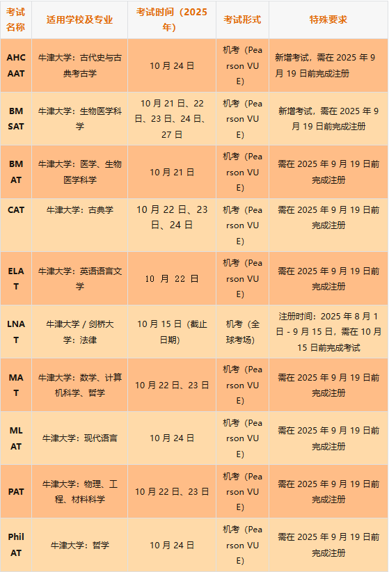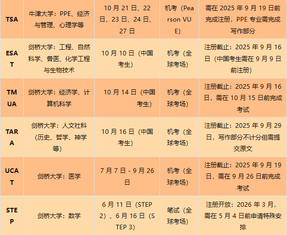 以下是牛津大学和剑桥大学 2026 年入学主要 Admission Test 的考试时间汇总表(截至 2025 年 9 月最新信息):