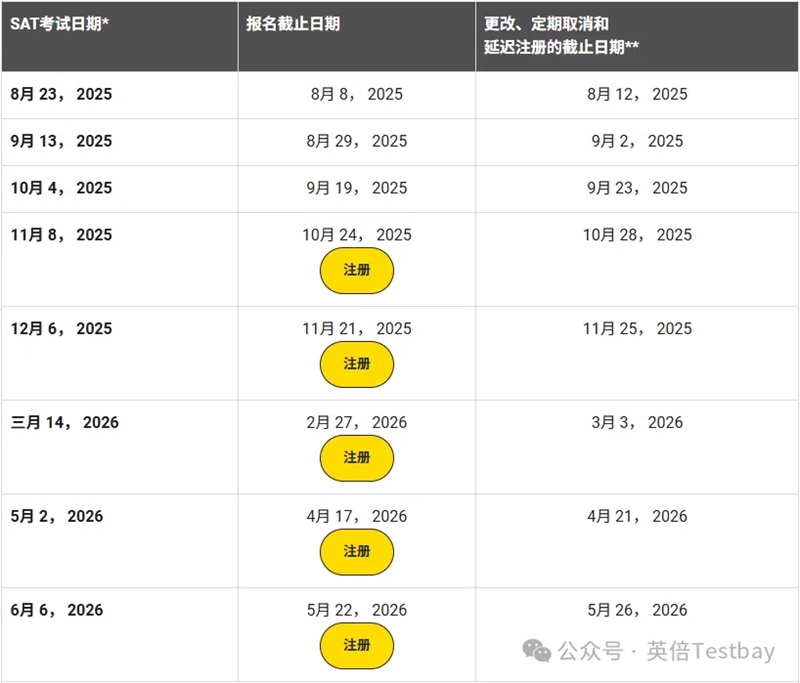 CB官方已在官网更新了2026下半年及2027年春季的SAT考试日期安排