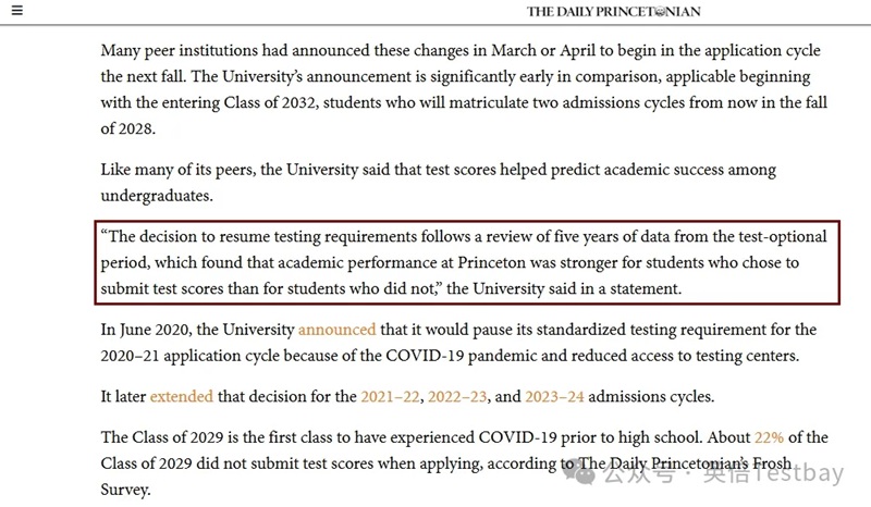 最新重磅!普林斯顿大学宣布: 从2027-28学年起,本科申请者将被要求提交SAT或ACT考试成绩,意味着7年的“Test-Optional”标化可选政策结束。