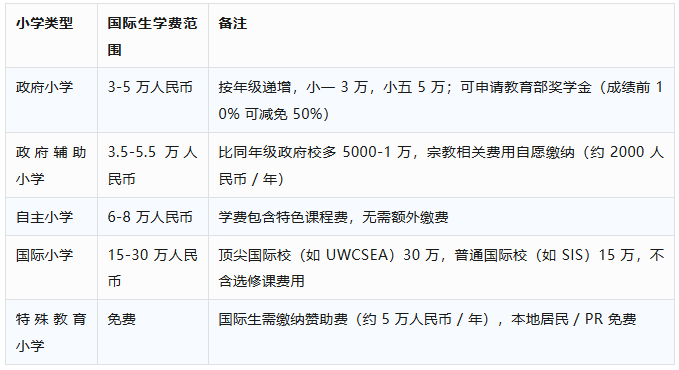 新加坡小学费用分 “学费 + 杂费”,不同类型差距悬殊,家长需提前做预算: