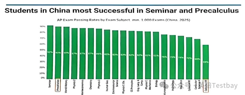 通过率差异显著:AP Seminar(92%)和预备微积分(90%)通过率最高,成为 “易通过” 科目代表;而微积分 AB(59%)通过率垫底,成为考生需要重点攻克的难点。