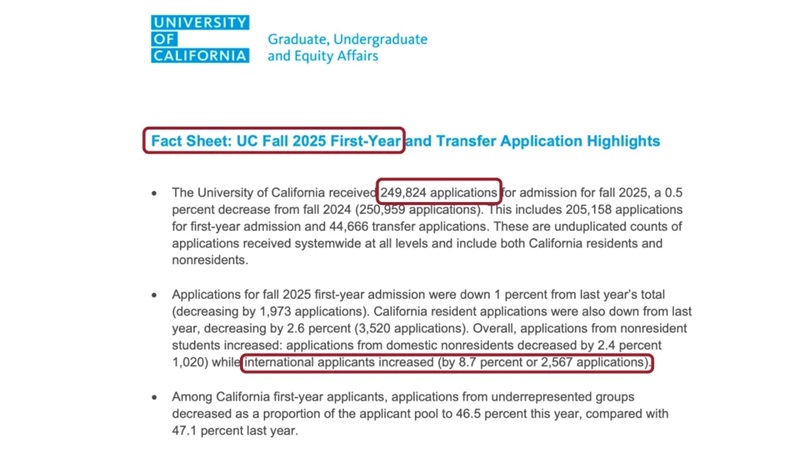 近年来,加州系大学凭借整体排名稳步攀升、学费性价比高、标化成绩可选提交、毗邻高新科技产业区以及西海岸阳光沙滩的宜居气候等多元优势,持续吸引着全球申请者的目光。以2025申请季为例,尽管加州大学体系整体申请者数量较上一周期微降0.5%,但国际生申请人数却逆势增长了2,567人,也客观展现国际生源圈层在加州大学申请中竞争愈发白热化。