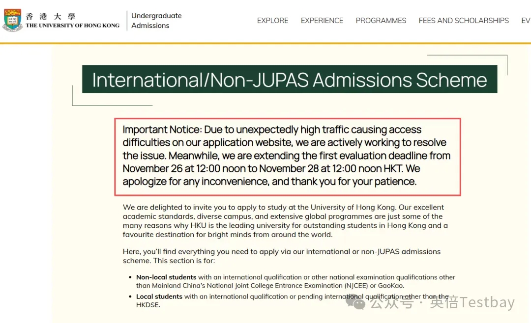 港大首轮申请原定11月26日截止,但由于热度爆棚系统直接罢工~ 为让每位考生都能顺利提交申请,校方通知:申请截止日期延长至11月28日。