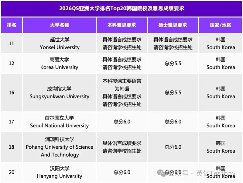 韩国留学正成为亚洲教育“新焦点”,凭借优质教学、浓厚文化氛围和完备留学生支持政策,吸引中国考生青睐。2026QS亚洲大学排名中,韩国与中国内地并列拥有最多跻身前20的高校,包括延世大学、高丽大学等名校,展现强劲竞争力。更利好的是,韩国名校100%认可雅思成绩,全英文授课项目助力“一证通行”。对考生而言,韩国留学教育质量高、文化相近、生活便利,还能兼顾追剧与学习,性价比突出。