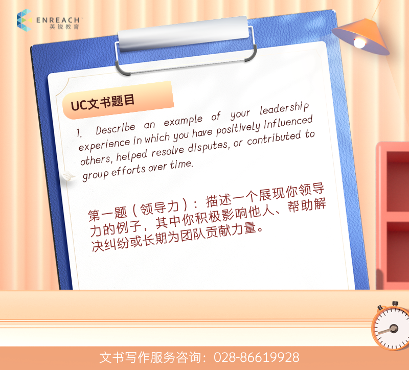 需要你思考:一个领导角色不仅仅是一个头衔。它可以意味着成为他人的导师,作为负责特定任务的人,或者在组织一个活动或项目中发挥领导作用。想想你的成就和你从这些经历中学到了什么。你的责任是什么? 你领导过一个团队吗?你的经历如何改变了你对领导他人的看法?你是否帮助你的学校、社区的教堂或组织解决了一个重要的纠纷?此外你的领导角色并不一定局限于学校的活动,其他方面,比如平时自己是如何帮助或照顾家人的也可以。
