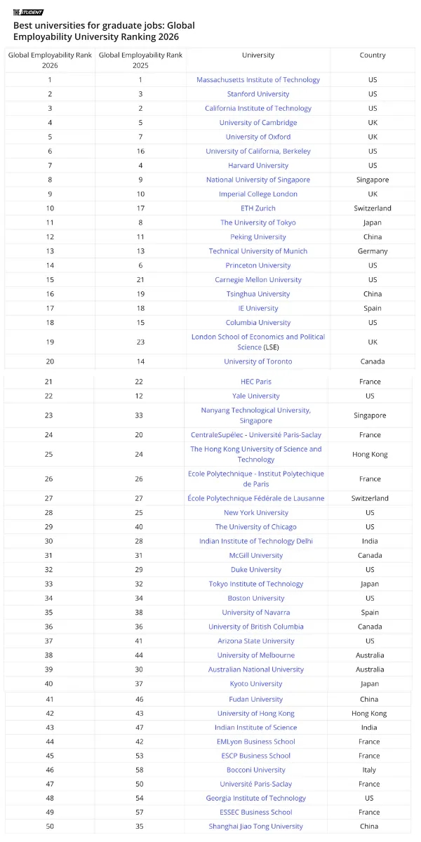 麻省理工学院连续多年稳居全球榜首,斯坦福大学攀升至第二位,加州理工学院位列第三。“全美第一公立校”加州大学伯克利分校表现尤为亮眼,从去年第16名跃升至第6名,其校友网络广泛分布于科技巨头、金融及咨询领域,亚马逊、安永、苹果、Meta、德勤等知名企业均为其头部雇主。