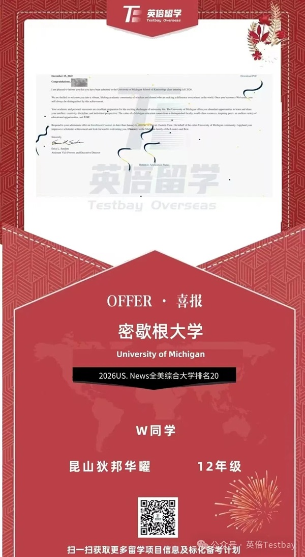 本期高分学员我们荣幸地邀请到刚刚在ED阶段斩获密歇根大学安娜堡分校Offer的英倍学员Brian。作为全球顶尖的公立研究型大学,密歇根以其卓越的学术实力和多元的校园文化著称,常年位列U.S. News美国大学排名前列,被誉为“公立常春藤”。Brian如何在激烈的申请竞争中脱颖而出,他的备考历程充满哪些挑战与突破?让我们一起走进他的故事,探索在英倍的学习如何助力他实现梦想。
