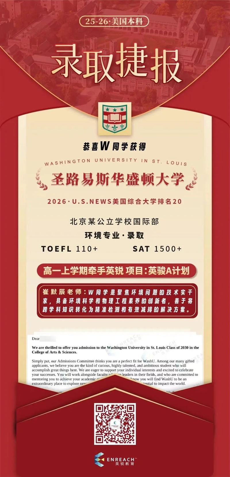 Daniel的申请规划核心在于一条清晰而独特的学术叙事:一位运用物理与工程智慧解决环境问题的青年创新者。从高一起,经过我们综合喜好、擅长程度和发展前景分析专业选择,他坚定投入电子工程领域,在老师的指导下独立设计了多功能空气质量检测仪器。基于我们的建议,他没有局限于传统的工程申请路径,而是敏锐地将科研项目与环境科学、应用物理等专业方向结合。从环境污染到听障赋能,他的工程实践在技术精进之外也始终贯穿着强烈的人文关怀与社会责任感。为听障人士研发的“骨传导音乐背心”展现了其将工程技术用于关爱弱势群体的温度与专利级别的创新能力。这份贯穿简历和文书的清晰“人设”,使其在众多高分申请者中脱颖而出,留下了不可替代的印象。Daniel在托福提升上并非一帆风顺,高一12月份才首考的他,在早申请前终于考取了109,所以经过我们一起讨论权衡,Daniel没有盲目冲击更高排名但录取风格不契合的院校,而是明智地选择了与自身特质高度匹配的圣路易斯华盛顿大学。该校不仅工程学院实力雄厚,其跨学科研究文化、灵活的转专业政策,以及对学生将创新应用于社区改善的重视,都与Daniel的背景完美契合。正是这种精准的自我认知、战略性的材料呈现与高度契合的选校相结合,为他叩开了顶尖学府的!