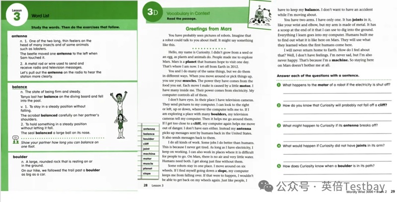 跟4000词系列的词汇书一样,Wordly Wise 3000也是强调在语境中通过上下文更好的去理解和运用单词,精心设计多种练习,比如词汇的语境用法using words in context, 词汇之间的关联making connections, 词的英文释义determine meanings, 选词造句completing sentences,词汇在文章中的用法vocabulary in context, 选词创作小作文vocabulary extension等不同形式的词汇,阅读和写作练习,反复帮助学习者理清所学词汇的概念、区分近义词之间的区别,掌握词汇之间的逻辑关系,词汇在语境中的用法,最后能在写作中灵活运用词汇。