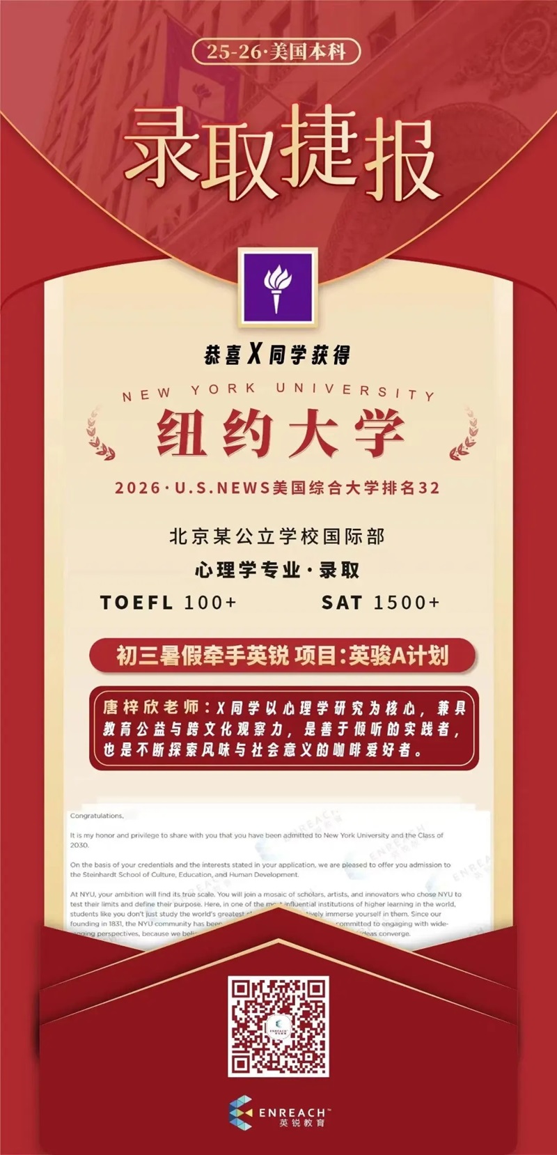 直到收到录取,才意识到:低预期不是自我设限,而是给可能性留出呼吸的空间。就像我家长说的:“纽大在国内认可度高,资源多,以后考研找工作都方便。”