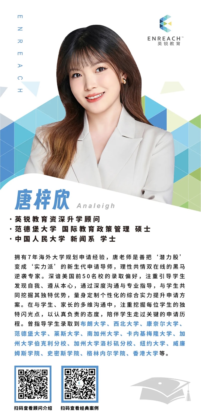 在选校策略上,尽管 Terry 具备较强的标化成绩与AP课程背景,但成绩单中的阶段性波动使申请并非零风险。在充分权衡个人特质与院校文化后,我们将早申目标锁定在高度重视跨学科探索、城市议题与社会参与的纽约大学。NYU 所强调的多元背景协作、公共讨论氛围与社区连接机制,恰好放大了他在“倾听—连接—行动”上的优势,也最终助力 Terry 在 ED1 阶段获得梦校录取!