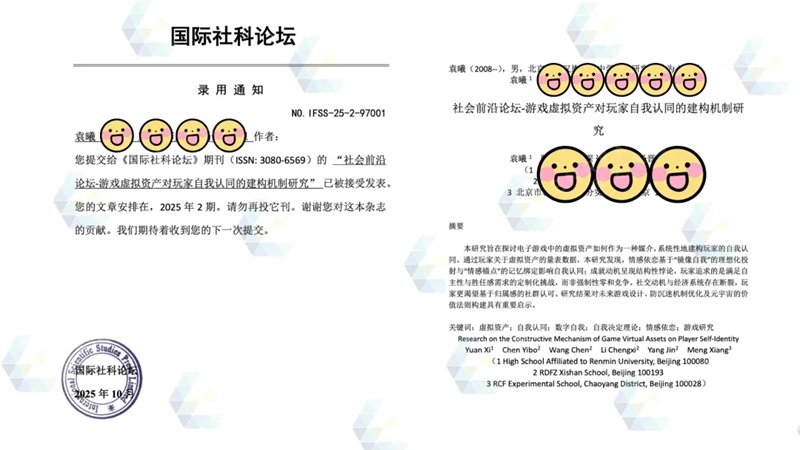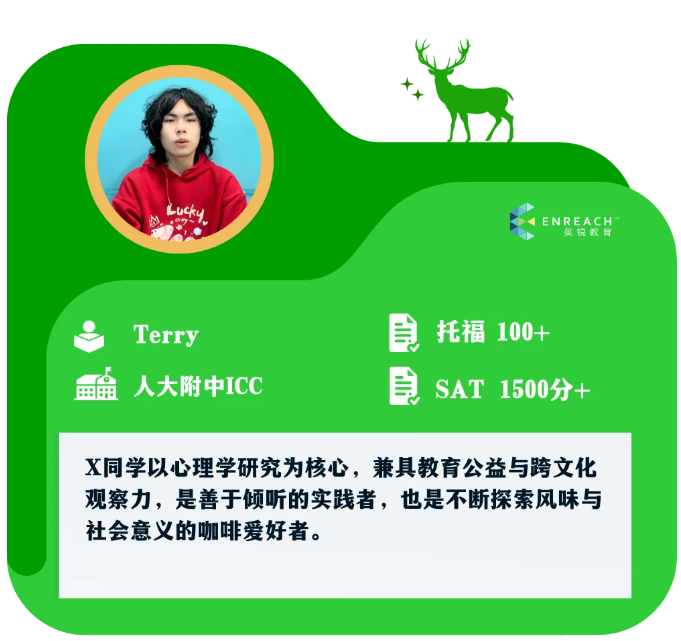 Terry 的申请规划核心,建立在一条清晰而稳定的个人叙事之上:一位以心理学为学术工具,持续关注“被忽视的声音”,并尝试搭建对话空间的学生。从高一开始,在系统评估个人兴趣与其独特的教育背景后,结合 Terry 善于抽象思考的特质,我们逐步将心理学确立为学术主线,并围绕教育公平、群体差异与社会结构展开深入探索。无论是哈佛大学的心理学夏校、自主学习宾大的相关网课,还是针对早培学生心理健康的独立研究,Terry 始终将学术训练与现实议题并置思考,逐渐形成了稳定的研究方向。