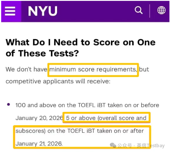 分阶段明确要求:2026年1月前参加的旧版托福,最低要求90分;2026年1月及之后参加的新版托福,最低要求4.5分;2026年1月21日之后的新版托福,最低要求提升至5分。4.5分对应旧版托福84-97分,整体要求与改革前基本持平。