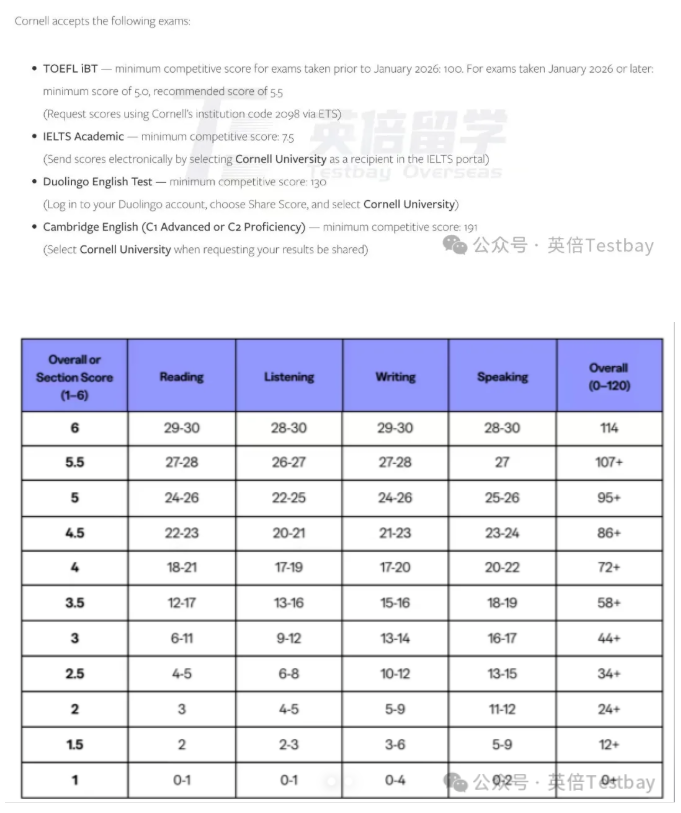 康奈尔大学官方宣布,新托福成绩要求底线为5分,建议达到5.5分;老托福要求为100分。该分数对应旧版托福106-113分,属于顶尖院校的常规高分要求,较改革前无明显下调。