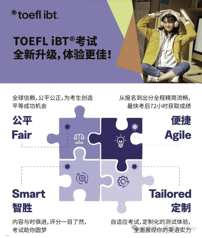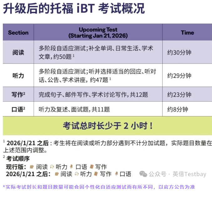 2026年1月21日起,托福iBT将迎来全面升级——更贴近真实学术与生活场景、引入自适应出题机制、对接CEFR国际标准、最快考后72小时出分!旨在为每位考生提供更公平、灵活、高效的个性化考试体验。