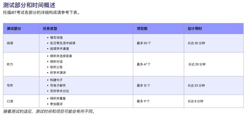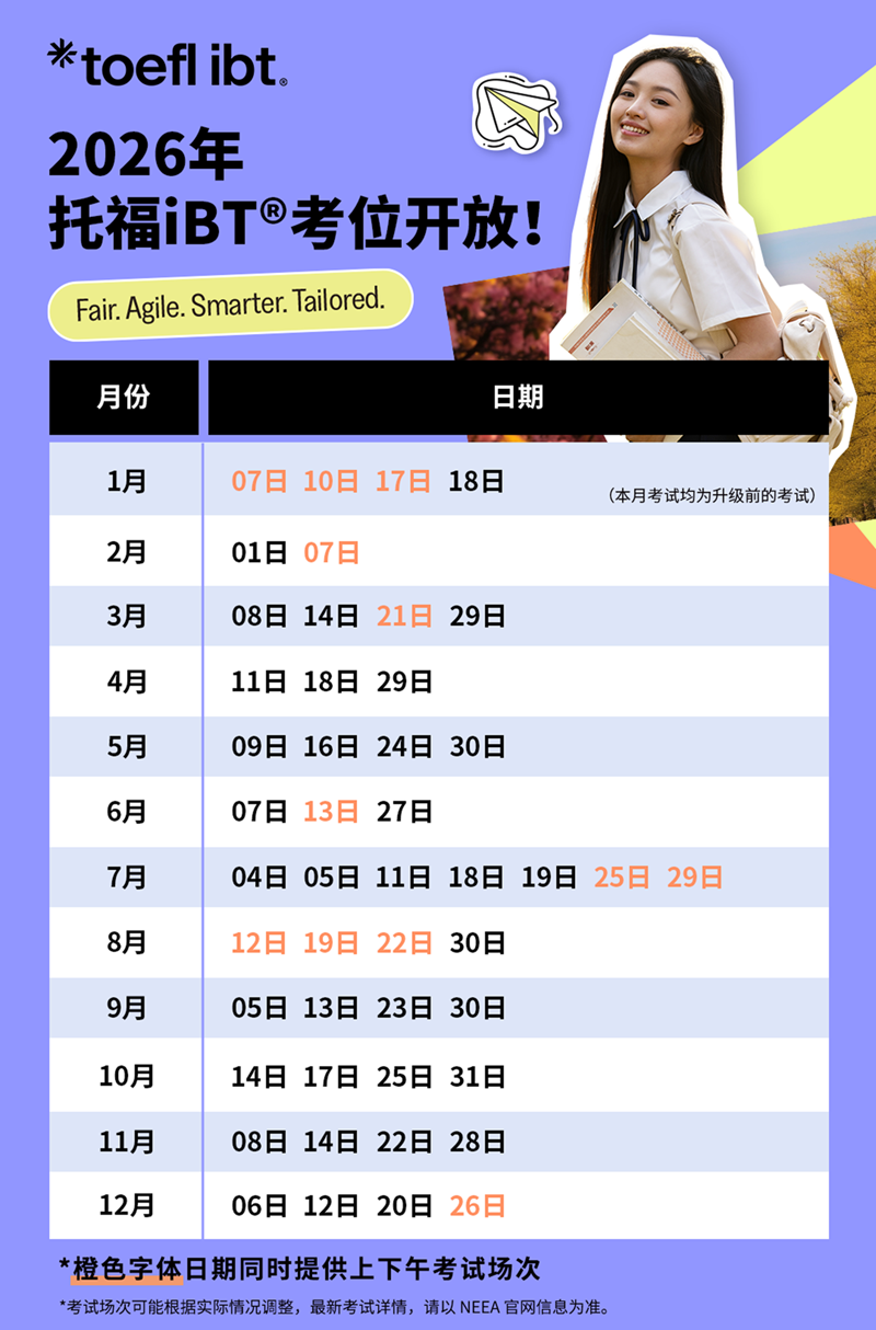 托福官方在发布2026年考位信息,而官网这边也更新了各科目的考试细则。托福考试的阅读和听力部分在题量与时间分配上均有所调整。