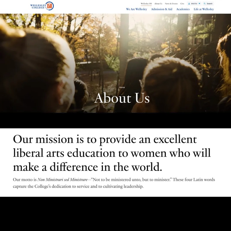 第一次看到Wellesley是九年级一次极其随机的school research。始于我开始看美高的选校,莫名其妙地从Niche转换到U.S. News的ranking,又莫名其妙划到了LAC的ranking。九年级的我是一个极其功利的人,所以只看了前五名,觉得前五之外的学校不值得我花时间了解。我直接点开了排名第一的Williams,然后是第二的Amherst,第三的Swarthmore —— 挨个看了一遍,没什么感觉。直到我点开第四名的Wellesley,它的mission statement直接让我记了四年: