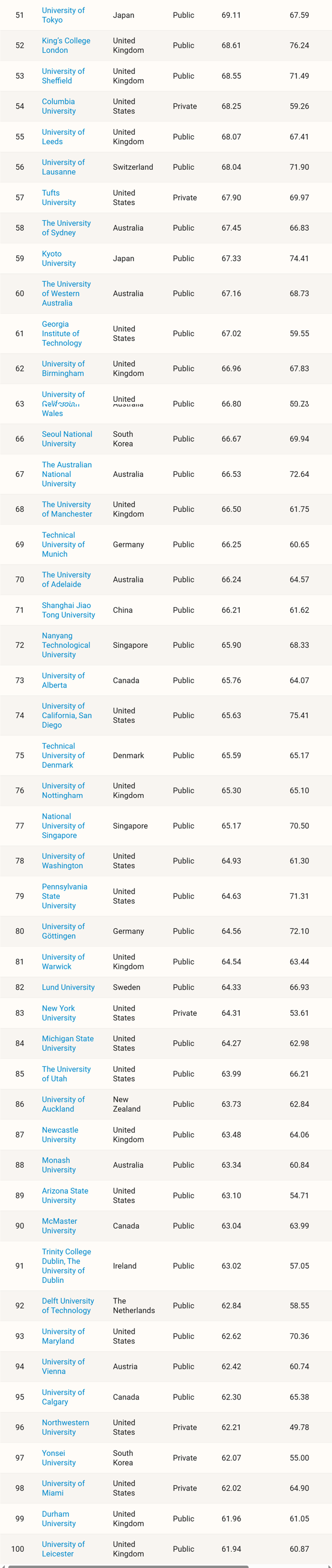 日本东京大学和京都大学进入前100名,分别位列第51名、第59名。