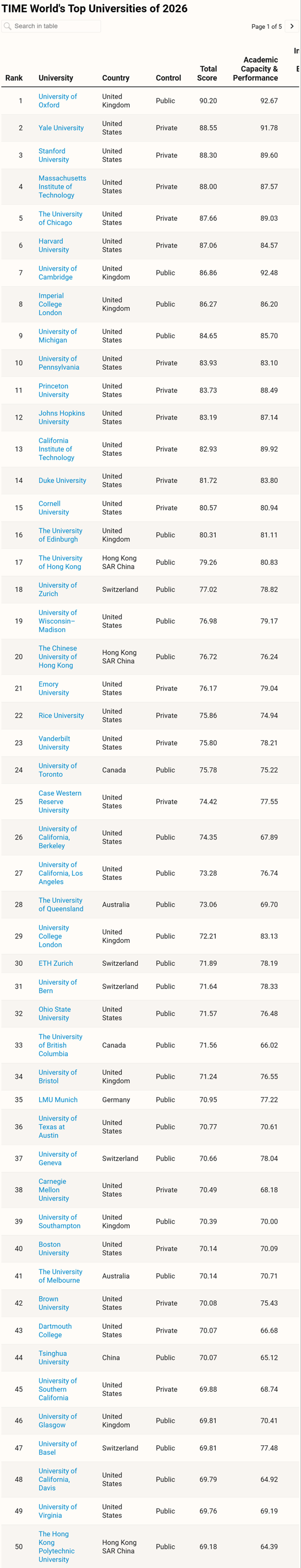 TIME 2026全球最佳大学排名TOP100榜单