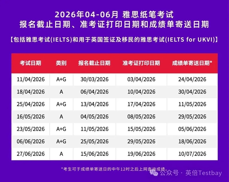 春启新程,逐梦当时。就在刚刚雅思官方发布了2026年雅思考位信息,具体包括2026年4-6月用于英国签证及移民的雅思纸笔考试和机考、2026年4-6月雅思机考的报名截止日期、准考证打印日期和成绩单寄送日期。准备今年春季考试的宝子们快来码住考试时间表。
