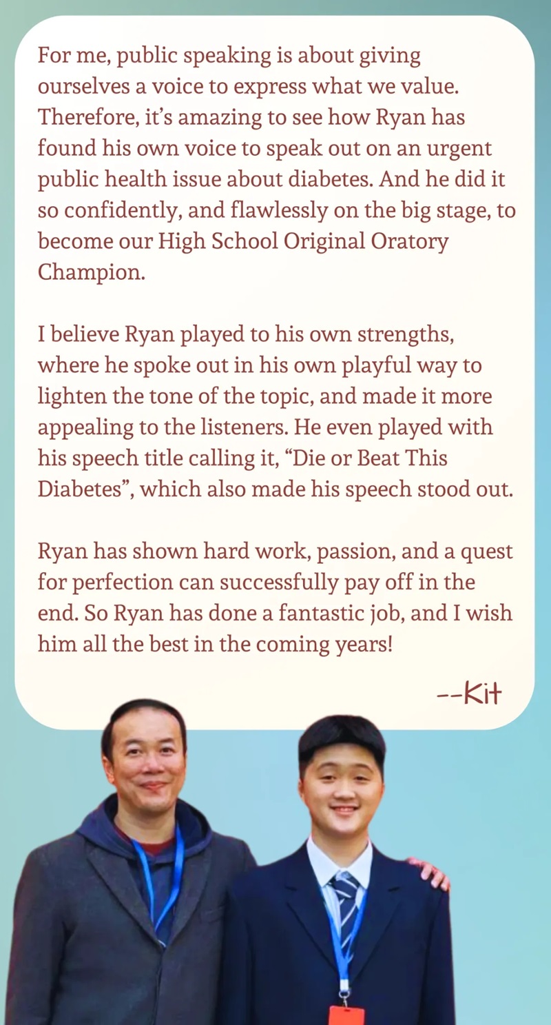 而Kit老师对他的寄语是:“在那么大的舞台上,自信、毫无失误地完成了演讲,他发挥了自己的优势,用那种 playful 的方式让沉重的话题变得更易接受——他甚至给演讲标题起了个巧思,‘Die or Beat This Diabetes’。他证明了,努力、热爱,以及对完美的追求,最终都会有所回报。”