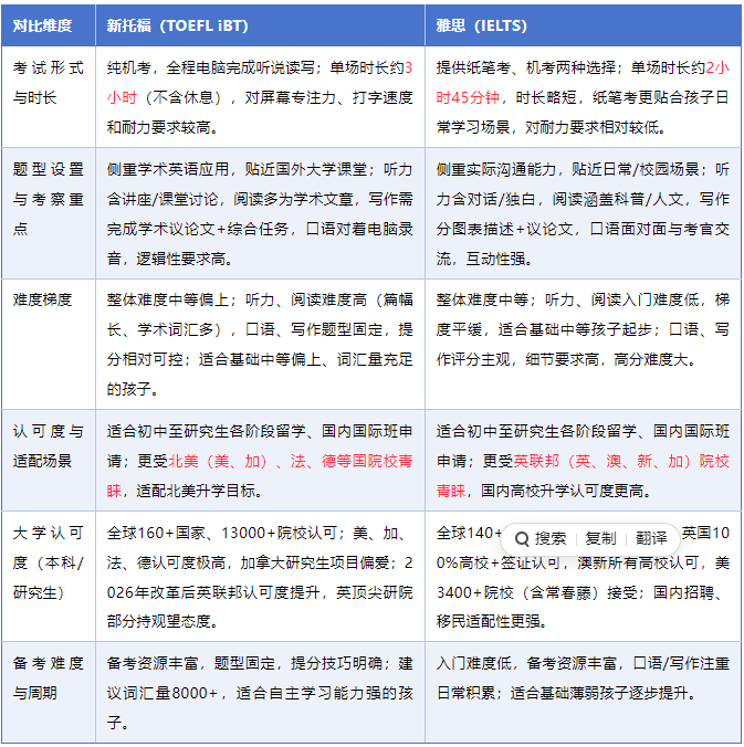 下面,我们从五大核心维度,全面对比新托福与雅思的差异,帮家长建立清晰认知。