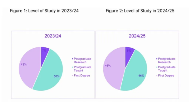 近日,英国文化教育协会发布最新数据:2024/25学年,英国国际学生人数下降5.9%,至697,365人,这主要归因于授课型研究生入学人数的急剧下降,而本科生人数保持稳定,研究型研究生人数则有所增长。