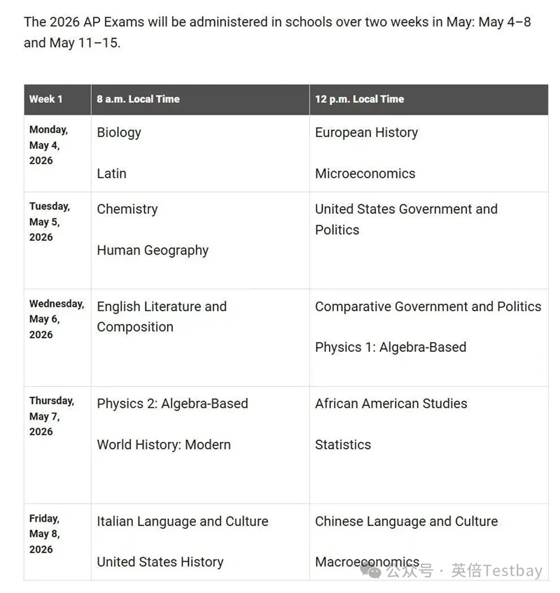 2026年AP考试将于2026年5月4日~8日和5月11日~15日两周内进行。