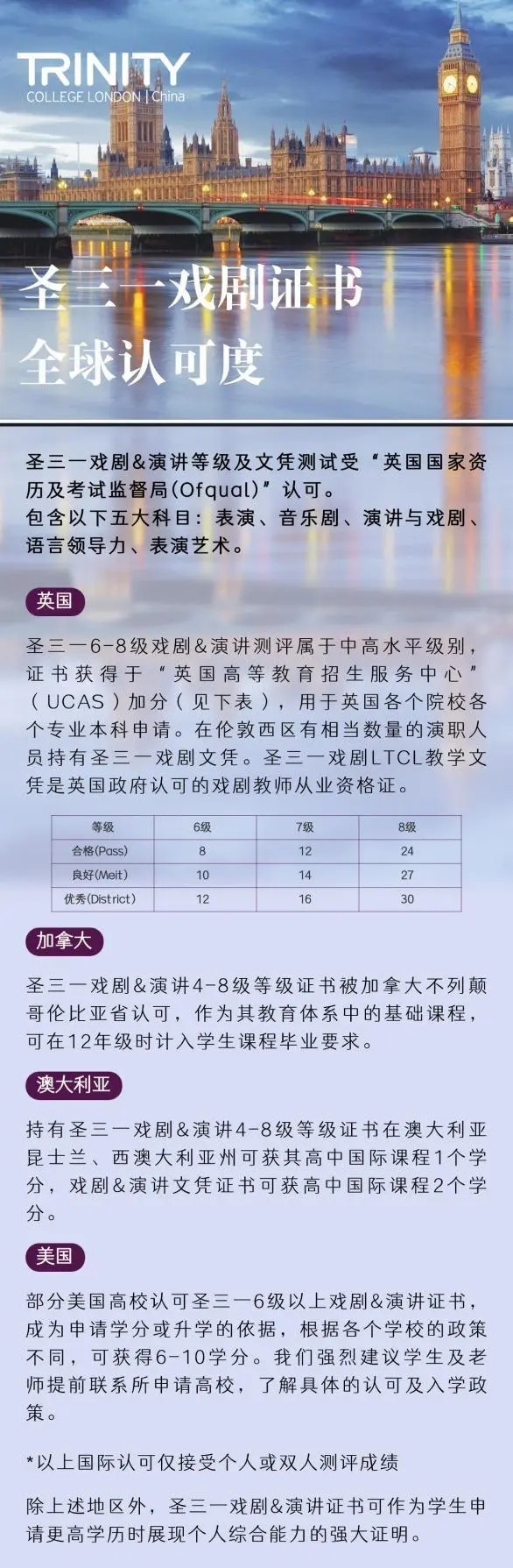 简单说:圣三一戏剧证书是一张被世界广泛认可的“能力证书”。不仅仅在戏剧表演专业领域被认可,更是孩子申请海外学校的有力加分项。