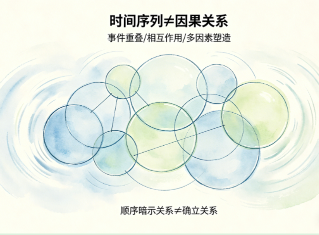 然而,将时间序列简化为因果关系很少是正确的答案。事件相互重叠、相互作用、同时展开,常常受到多种不易察觉的力量塑造。一个顺序确实可以暗示某种关系,但它本身无法确立这种关系——无论那个故事感觉多么令人信服。