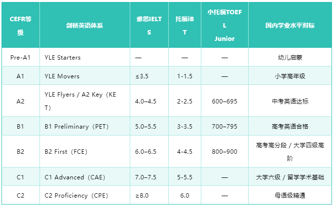 国内中高考虽无官方对标,但普遍认为其难度对应 A2(中考)、B1(高考),可结合剑桥英语、雅思 / 托福等考试自测等级,精准定位能力水平。