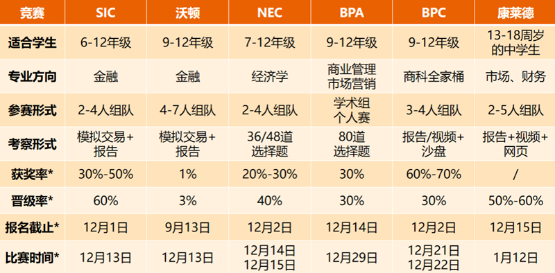 竞赛定位:全美三大商赛之一,国际上极具含金量的商科学术活动,适合 6-12 年级对商科感兴趣的学生,分为初中组和高中组。