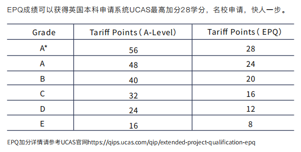 EPQ成绩等于一门A-level考试成绩的50%,含金量高于AS课程,被英国三大A-level考试局(AQA、Edexcel、CIE)认可和推崇。