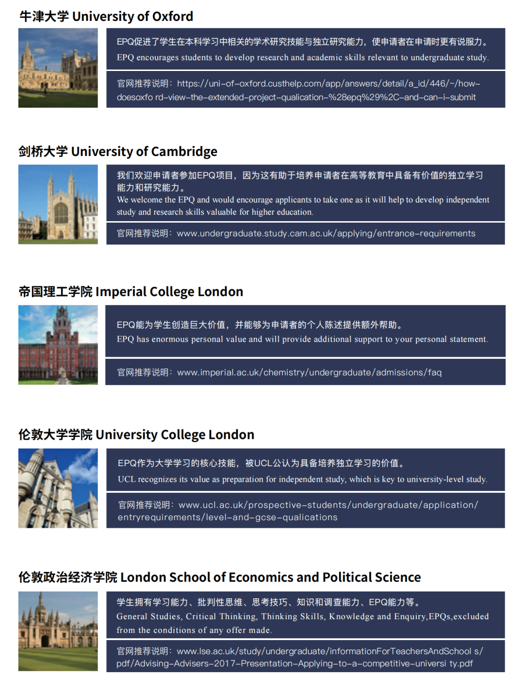 英国和美国名校官方明确表示欢迎有EPQ项目经历的学生,包括G5在内的世界顶级院校,均在官网对EPQ进行了官宣并推荐。能够出色完成EPQ项目的学生被证明具备高等教育强调的研究规划、独立学习和批判性思维能力,在同等课程和标化考试成绩的情况下,有EPQ认证的学生将拥有巨大的差异化竞争优势。在美国最普遍的申请系统(CA、CAAS、UC Application等)中,EPQ 均可作为学术经历和额外成绩的显著优势进行添加。