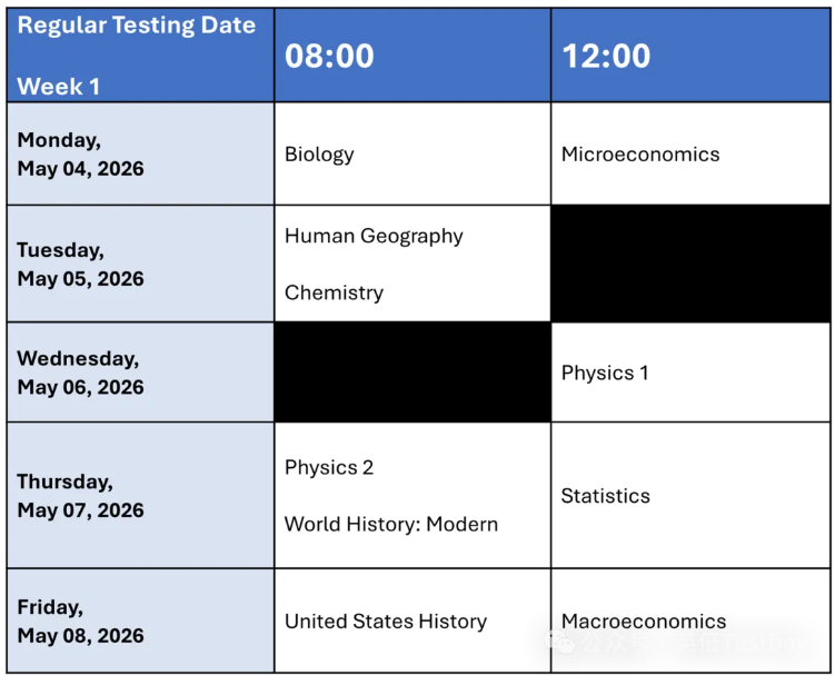 根据显示的考试周(Week 1, Week 2, Last-Testing, Art and Design)勾选(✅) 你需要报考的AP科目。仔细核对科目名称和考试时间(常规/延迟)。