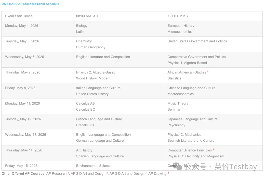 韩国Fulbright考评局正式开启了2026年AP考试第一轮报名。打算赴韩考试的学员们抓紧时间报名,在亚太地区,AP考试的考位竞争一向激烈——热门考点常常在报名开启后不久就被抢得所剩无几。每年下半年,不同国家和地区会陆续开放次年5月的AP考试报名,接下来一起看看韩国AP报名时间点。