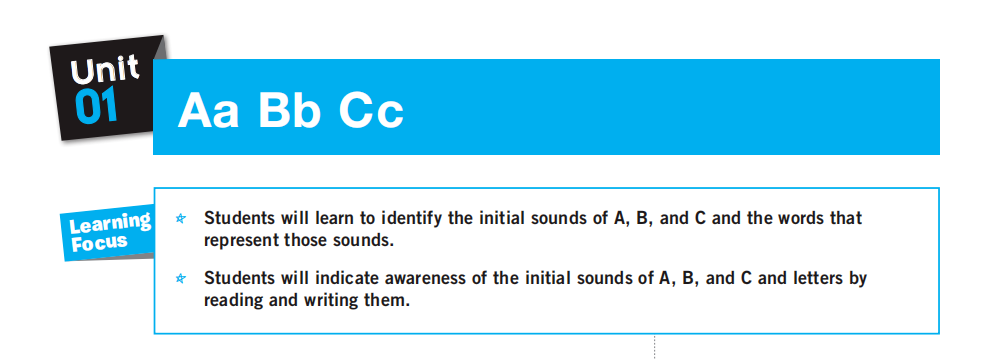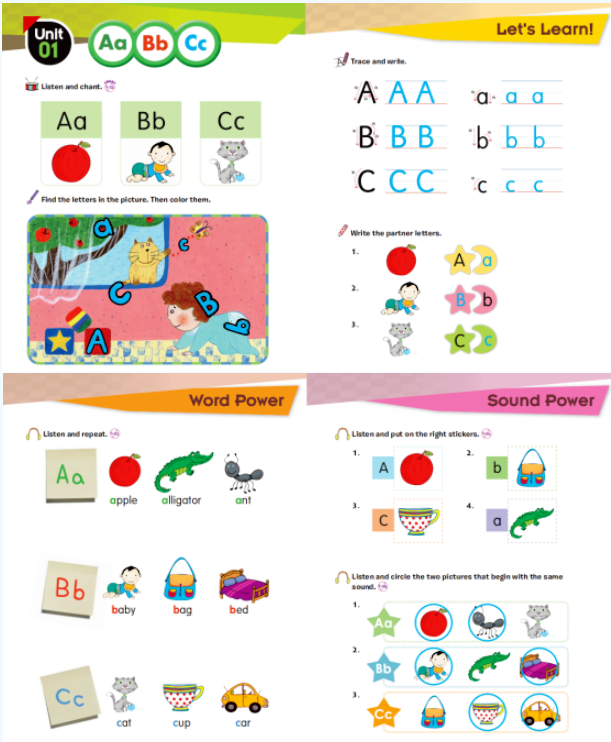 以L1-Unit 1的学习为例,在第一课中,老师会带学生们学习ABC三个字母,学生们会学习到Aa Bb Cc大小写(在课堂上,老师将采用校内使用的四线三格来教学生书写),做到会认、会读、会写,同时,学习9个分别以a b c为首字母的单词及掌握其字母发音方式。最后,老师会教学生一起学习并阅读含有所学9个单词的小故事,同时了解并理解 on.../在...上面 的使用。