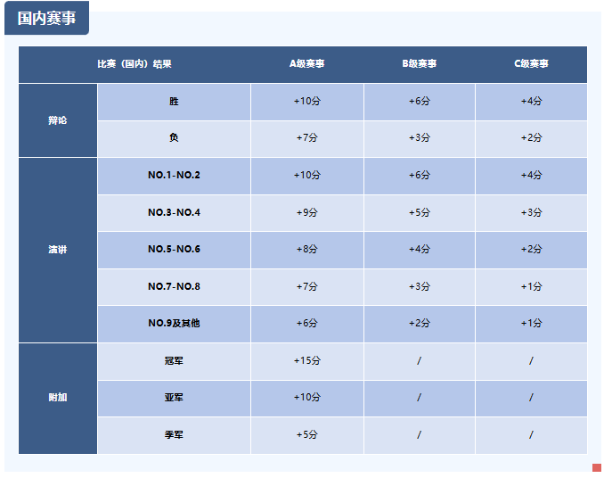 注册账号并缴纳会员费后即可成为WSDA正式会员,可累计积分参与全国排名。具有正式会员身份的选手可以通过参加WSDA演讲与辩论认证活动、组织或服务活动的方式来增加自己的积分。不同赛事或活动的积分规则不同:
